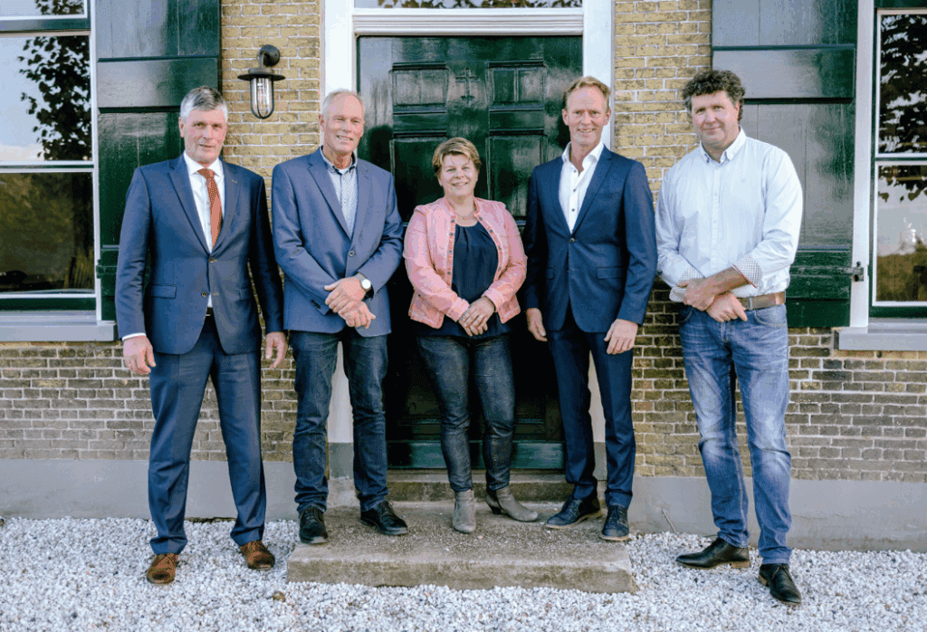 Het bestuur van Deltamilk bestaat uit leden melkveehouders. Van links naar rechts op de foto: Henk van der Wind (voorzitter), Ad van Rees, Corine Peek, Hans de Bruijn, Joost Wesselingh.